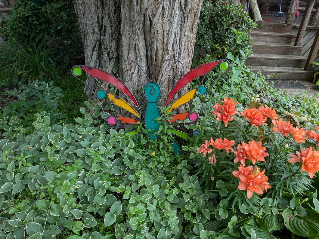 Bright, colorful 3-foot steel butterfly for wall hanging. The metal frame is hand-painted in vibrant colors, and the wings are made of sheet metal painted by hand.